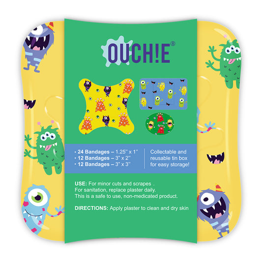 OUCHIE Adhesive Flex-Fabric Bandages | Assorted Shapes with Monster Party Prints | Colorful Resuable & Fun Tin Box | 48 Pack