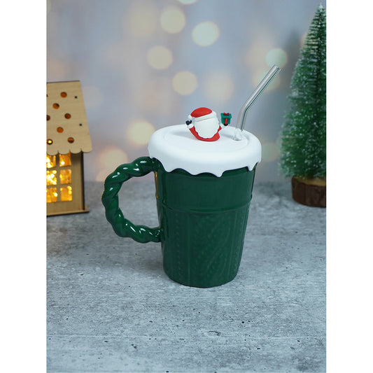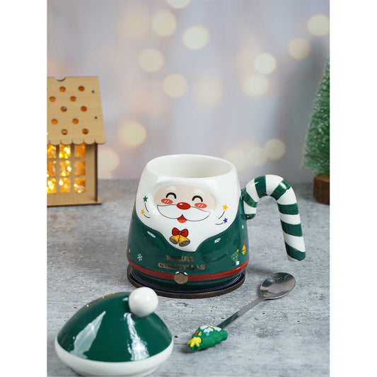Green Santa Candy Cane Handle Ceramic Christmas Coffee Mug with lid and tree embellished Stainless Steel Spoon