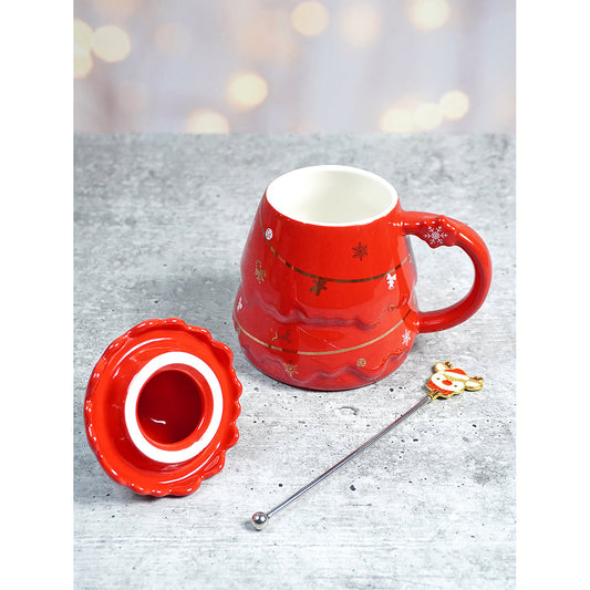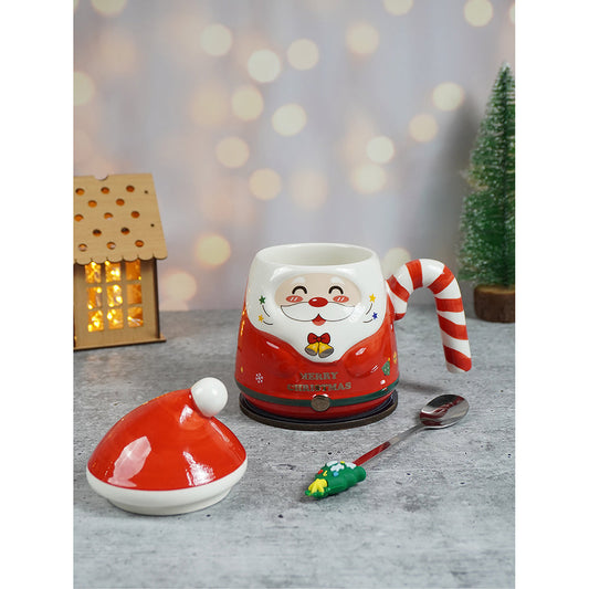 Red Santa Candy Cane Handle Ceramic Christmas Coffee Mug with lid and tree embellished Stainless Steel Spoon