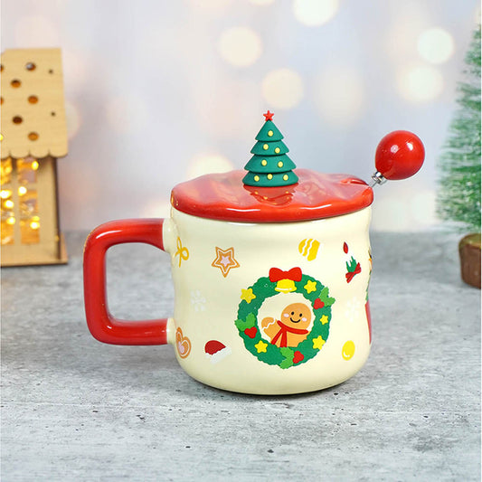 Christmas Character Faces Christmas Mug with 3d christmas tree Lid and Stainless Spoon.