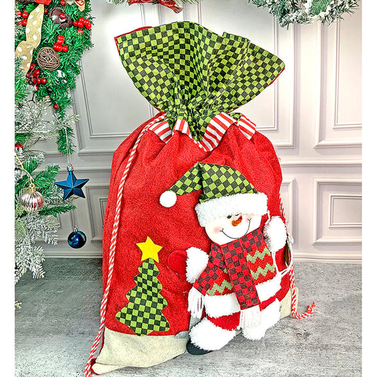 Snowman Green & Red Checks Christmas Sack for Christmas Gifts and Home Décor