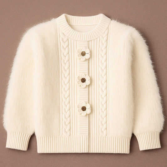 Cream Furry 3 flower Kintted Cardigan, sweatshirt for kids