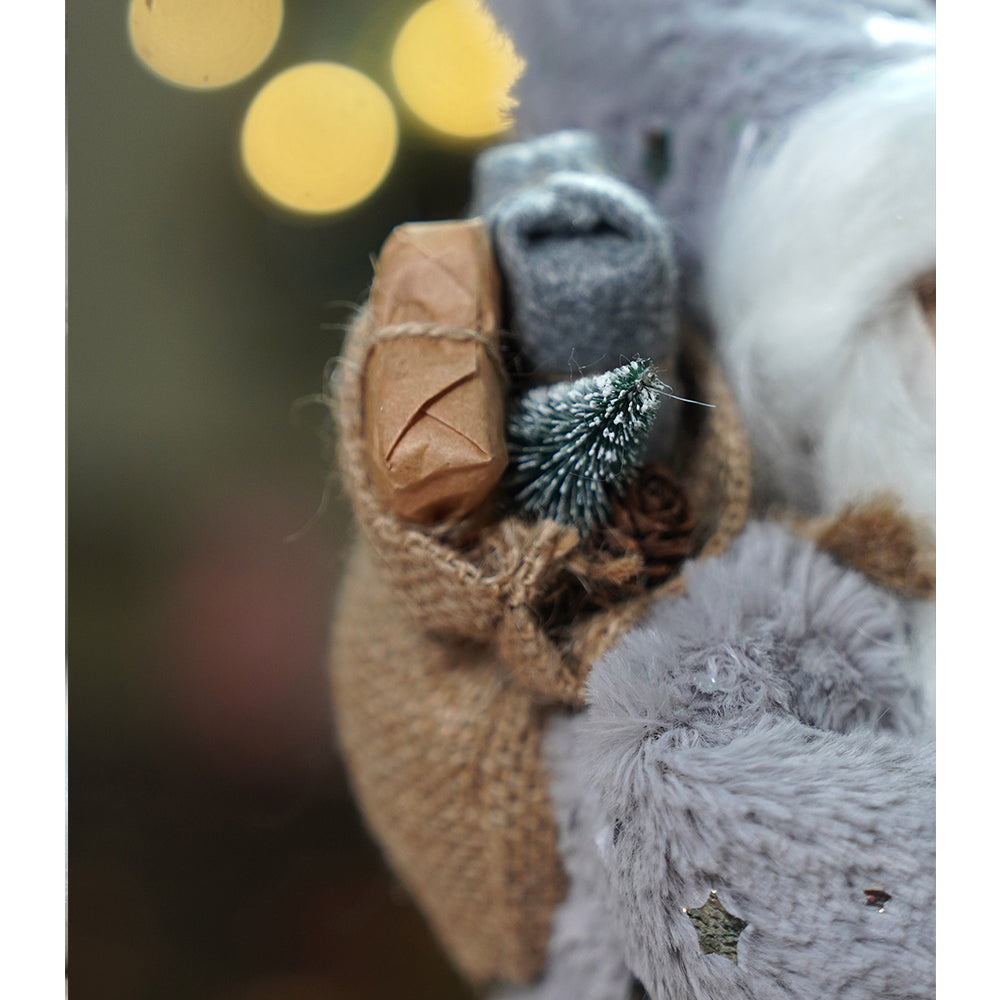 2. Detailing: Beautifully designed with textured fabrics, faux fur accents, and rustic wooden details, this Santa carries a sack filled with gifts in one hand, and a sledge tied with a rope in other hand, symbolizing Santa’s winter journey and the joy of festive preparation. The soft tones and natural textures make it a timeless, heartwarming décor piece.