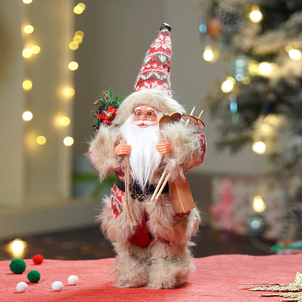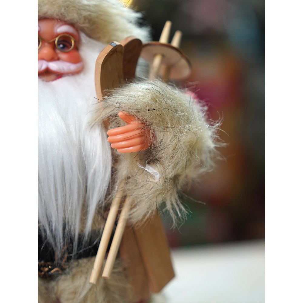 2. Detailing: Designed with soft fur fabric, snowflake-patterned knitwear, and wooden accessories, this Santa carries a pair of wooden skis in one hand and a burlap sack filled with pine branches and berries on his shoulder, symbolizing the spirit of winter adventures and the joy of Christmas giving.