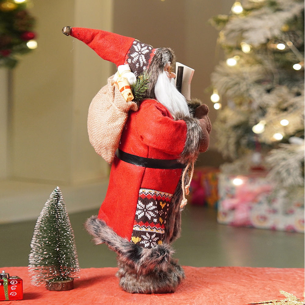 1. Exclusive Design: This delightful Santa, dressed in a maroon coat with grey faux-fur trims and knit detailing at the bottom, along with a red hat featuring a knit-patterned rim, brings a warm and rustic Christmas charm to your décor. With his cheerful smile, golden glasses, and long fluffy white beard, he radiates classic holiday joy, making him a standout addition to any festive setup.