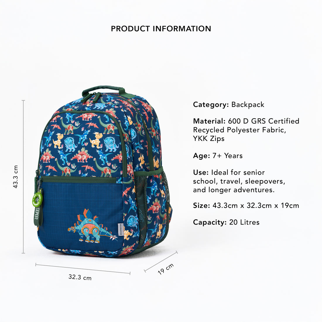 Millions of years ago, dinosaurs ruled the Earth strong, bold, and full of surprises. I carry a little of their magic in my sturdy frame, tough enough to guard your books and treasures. With wide straps and a strong base, I’m ready to march with you everywhere from school runs to roaring playtime adventures!