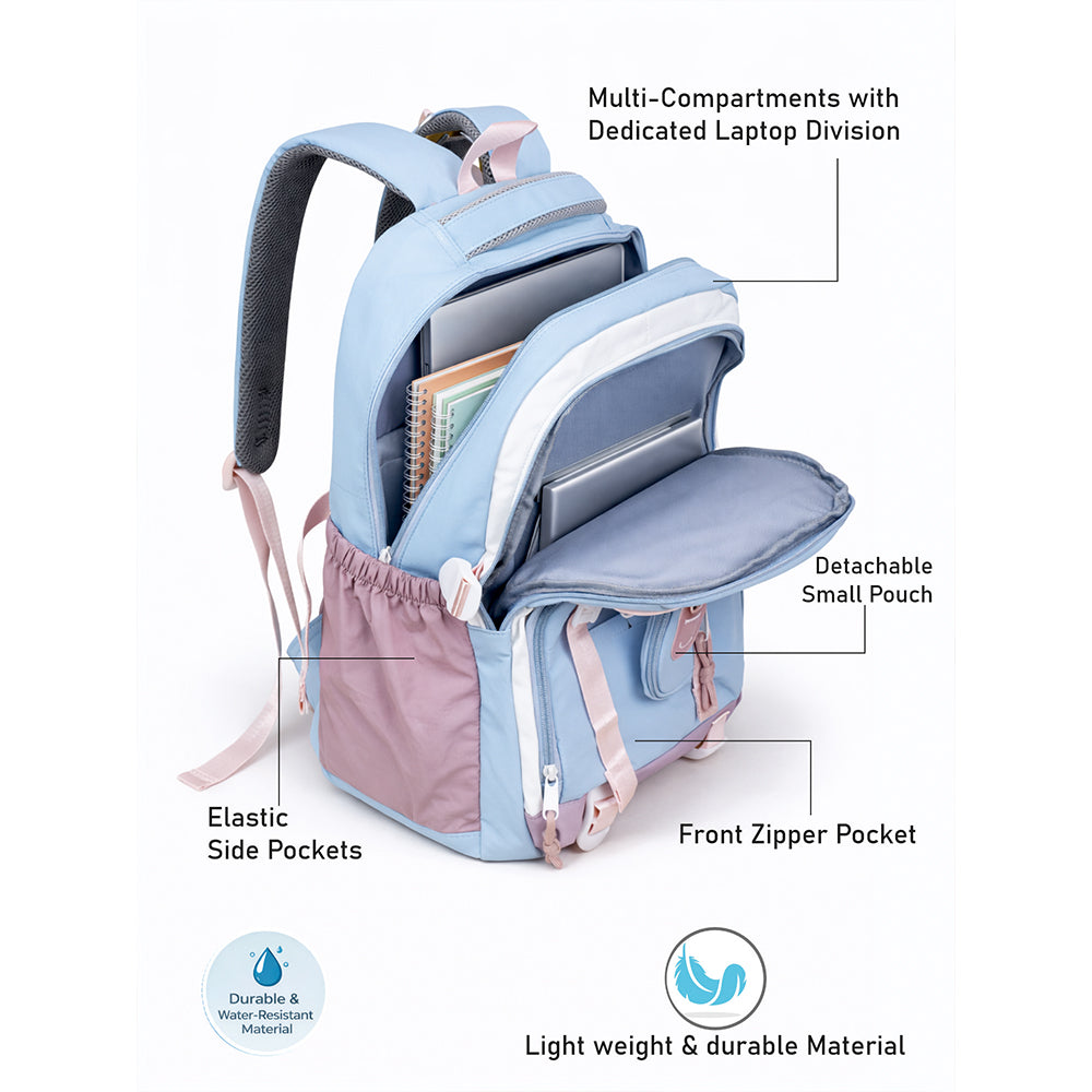 5. Attractive Color Combination: The refreshing blue combined with soft pink and purple gives this backpack a trendy, calming, and school-appropriate look that stands out effortlessly.