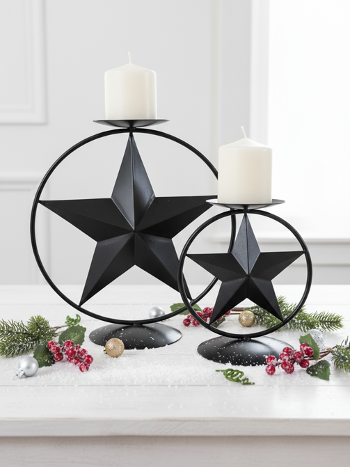 Add a modern, chique and sophisticated glow to your holiday decor with CLARA by SWEN, set of 2 Star Ring Tealight Holders. This dramatic duo features two different sizes, ideal for flanking a centerpiece or decorating any mantelpiece or table. CLARA comes as a pack of 2, each holder featuring a bold, three-dimensional five-pointed star suspended within a circular metal ring frame. The candle holders are crafted from durable metal with a sleek matte black, offering a contemporary, rustic farmhouse aesthetic that stands out against bright holiday colors. The top of the ring frame securely holds a flat metal saucer, perfectly sized for displaying tealight candles or small pillar candles and the bottom stands on a solid, round base, ensuring secure placement even on uneven surfaces. Illuminate your mantel with the sophisticated, starry glow of contemporary candle holder sets with CLARA by SWEN.