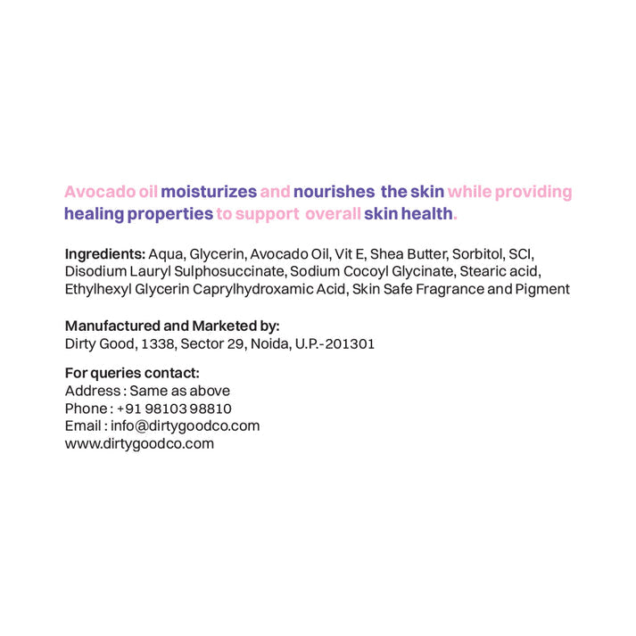 - Ingredients: Aqua, Vit E, Avocado Oil, SCI, Glycerin, Propylene Glycol, Stearic Acid, CAPB, Iscaguard, Skin Safe Fragrance Oil & Pigment.
