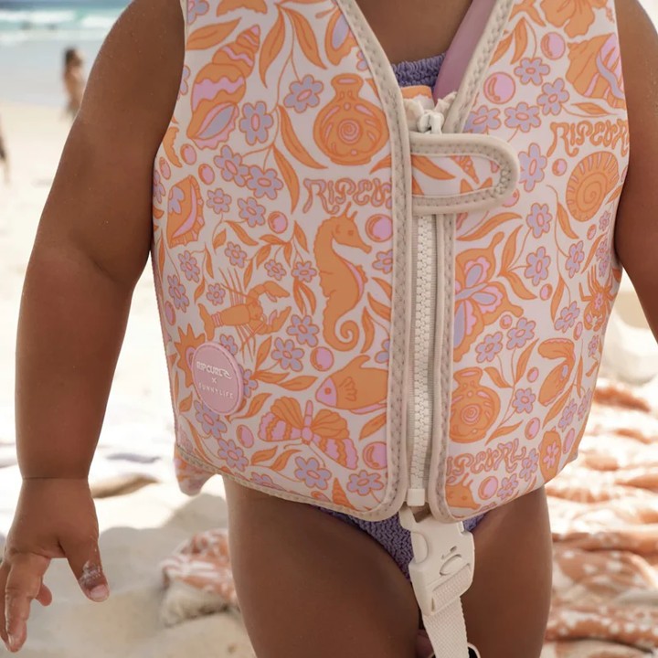 From paddling to pro, boost kids swim confidence. Official Rip Curl designer collection SUNNYLiFE x Ripcurl Swim Vest's are cute, practical, and comfortable and will be sure to make a splash wherever little ones go. Made from durable neoprene for buoyancy and warmth, the Kids Swim Vest is super comfortable for little ones. The Kids Swim Vest also features an adjustable safety strap between the legs and front zipper to ensure it is both reliable and well fitting.