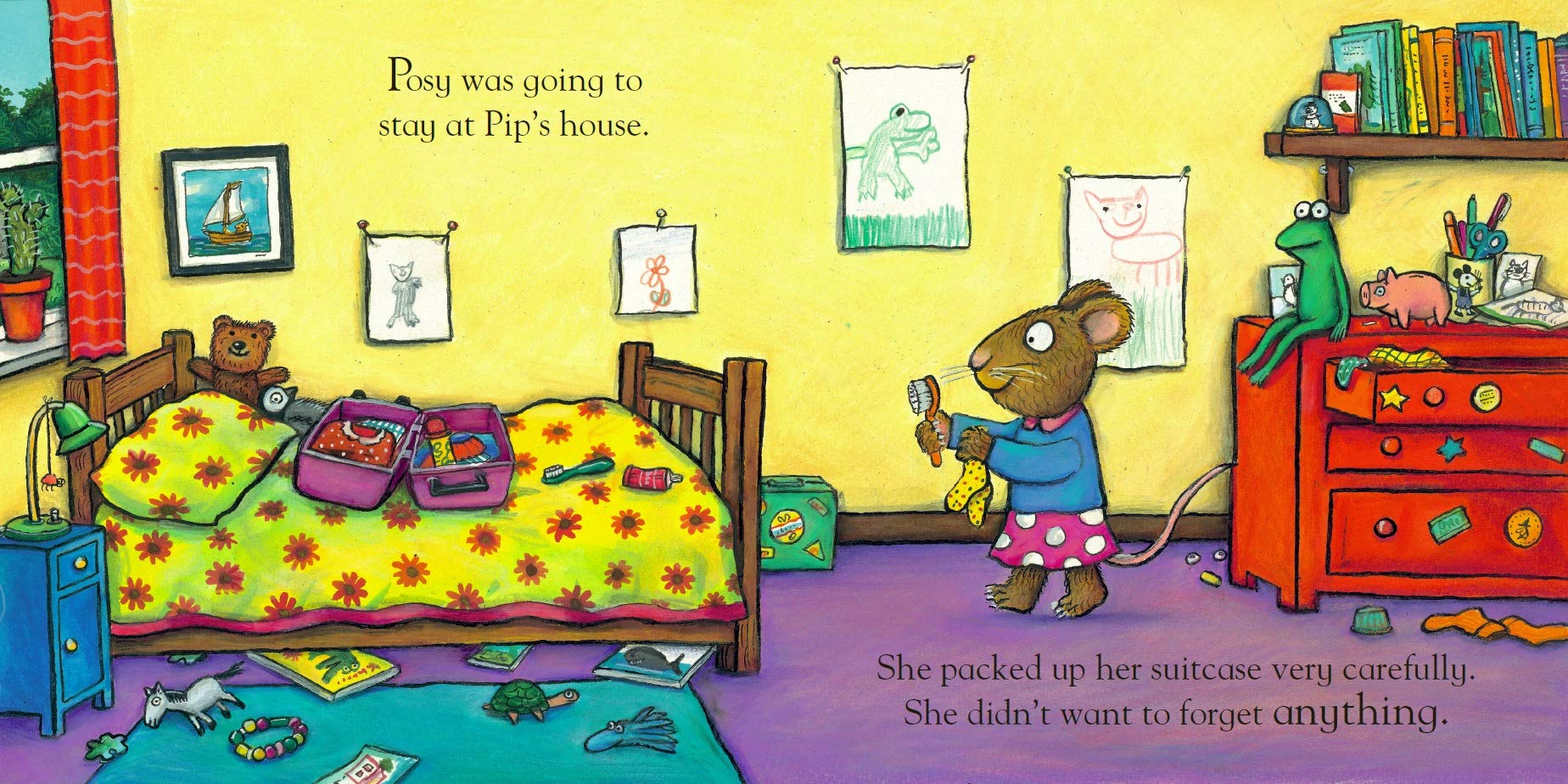 In The Bedtime Frog, Posy goes for a sleepover at Pip’s house. The friends have lots of fun together before bedtime. But just as they switch out the light, disaster strikes – Posy realises that she has forgotten her favourite frog toy. Keen to help his distraught friend, Pip offers Posy a range of different toys to substitute for her frog, including his own favourite frog money box. But none of them will do – “That’s the wrong frog!” Posy wails. It is only when Pip gives Posy his own, very favourite, pig toy that Posy is comforted and the friends can get a good night’s sleep, at last.