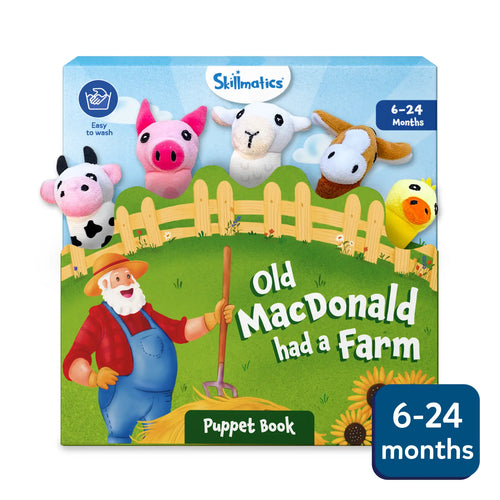 Introduce your child to the classic nursery rhyme with Skillmatics’ Puppet Book! This interactive finger puppet book for babies has fun puppets of adorable farm animals, perfect for wiggling around as you sing for your little one. Designed for children aged 6-24 months, this puppet book lets your baby enjoy storytime fun like never before! With bright, colourful illustrations and easy-to-move finger puppets, you can enhance your child’s sensory development while building a strong emotional connection with them. Perfect for boosting language development and early learning, shop our Old MacDonald Puppet Book for kids online today.