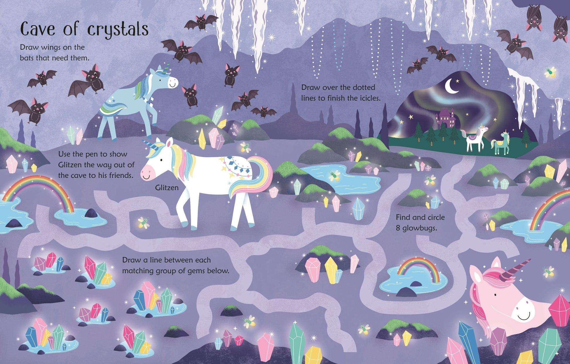 With unicorn-themed mazes to solve, dots to join, differences to spot, objects to count and dotted pictures and numbers to trace over, little children will have great fun completing the activities while practising the vital pen-control skills they need to be ready for writing. The wipe-clean pen can easily be rubbed off the shiny pages so children can do the activities again and again.