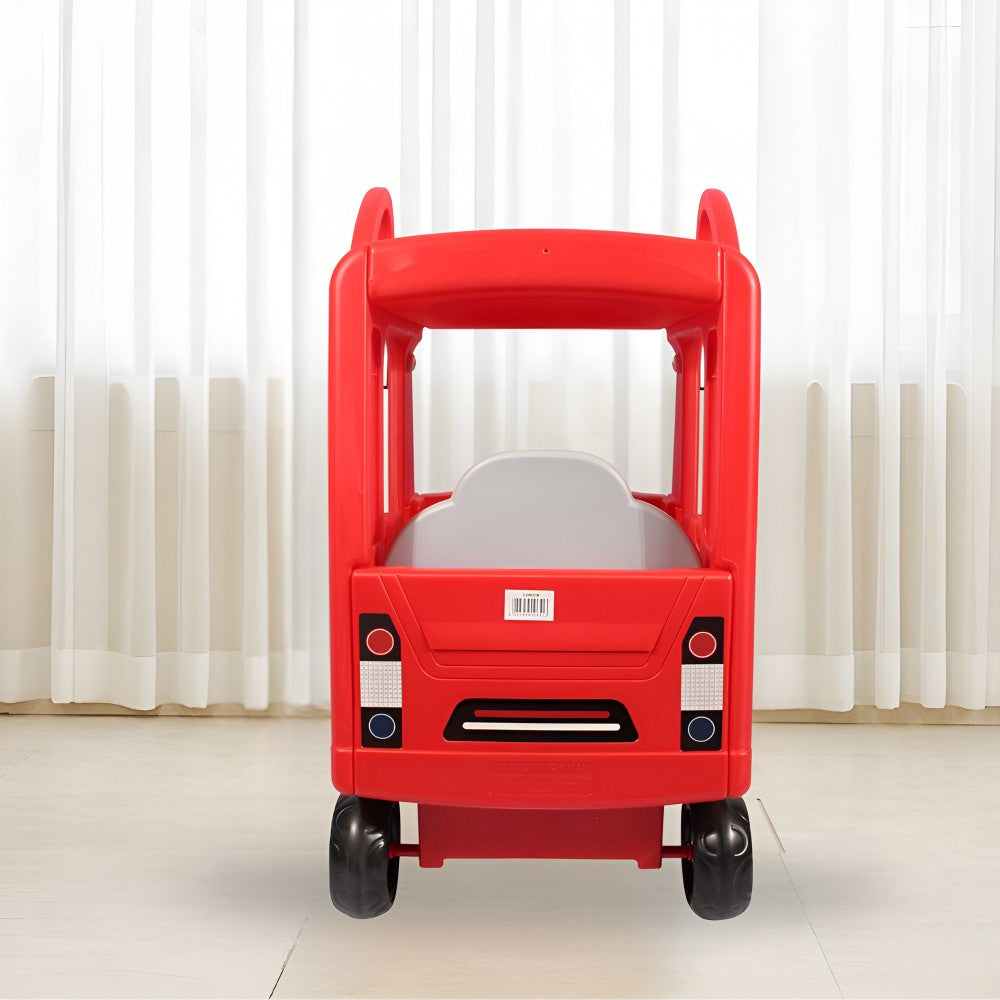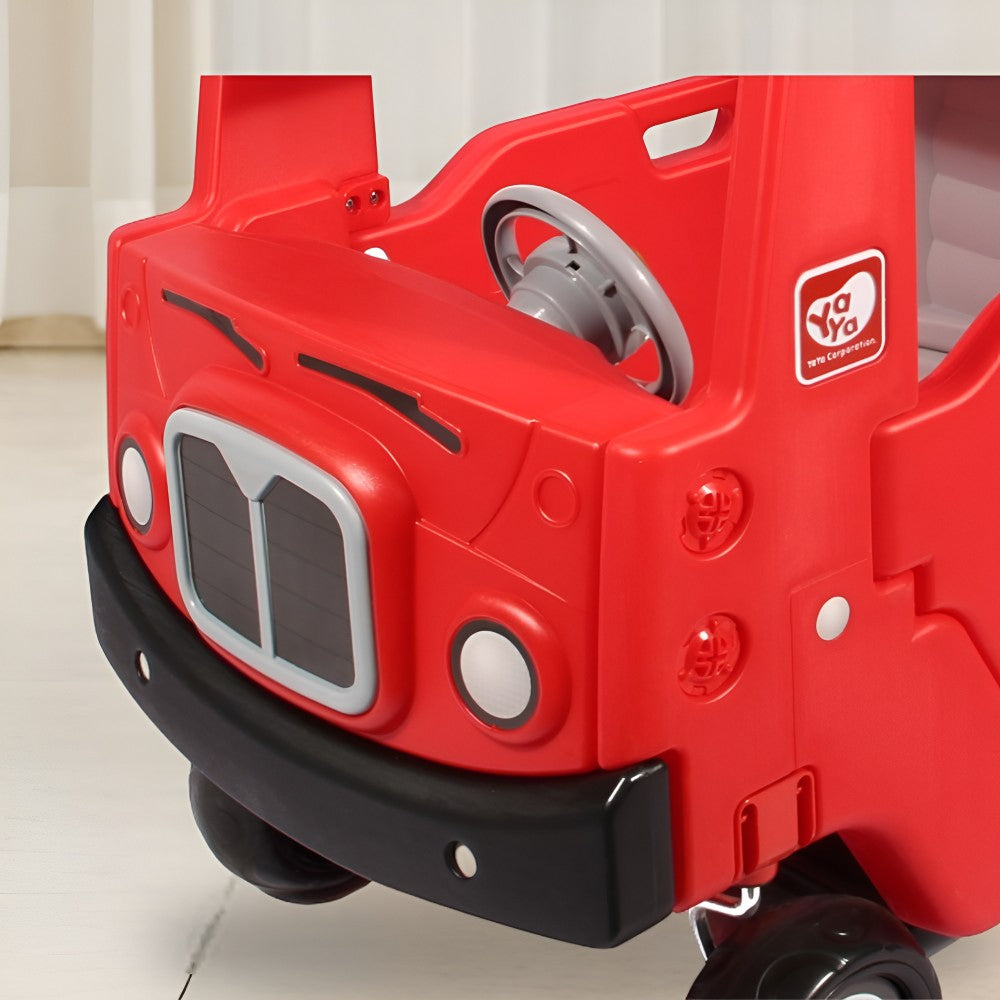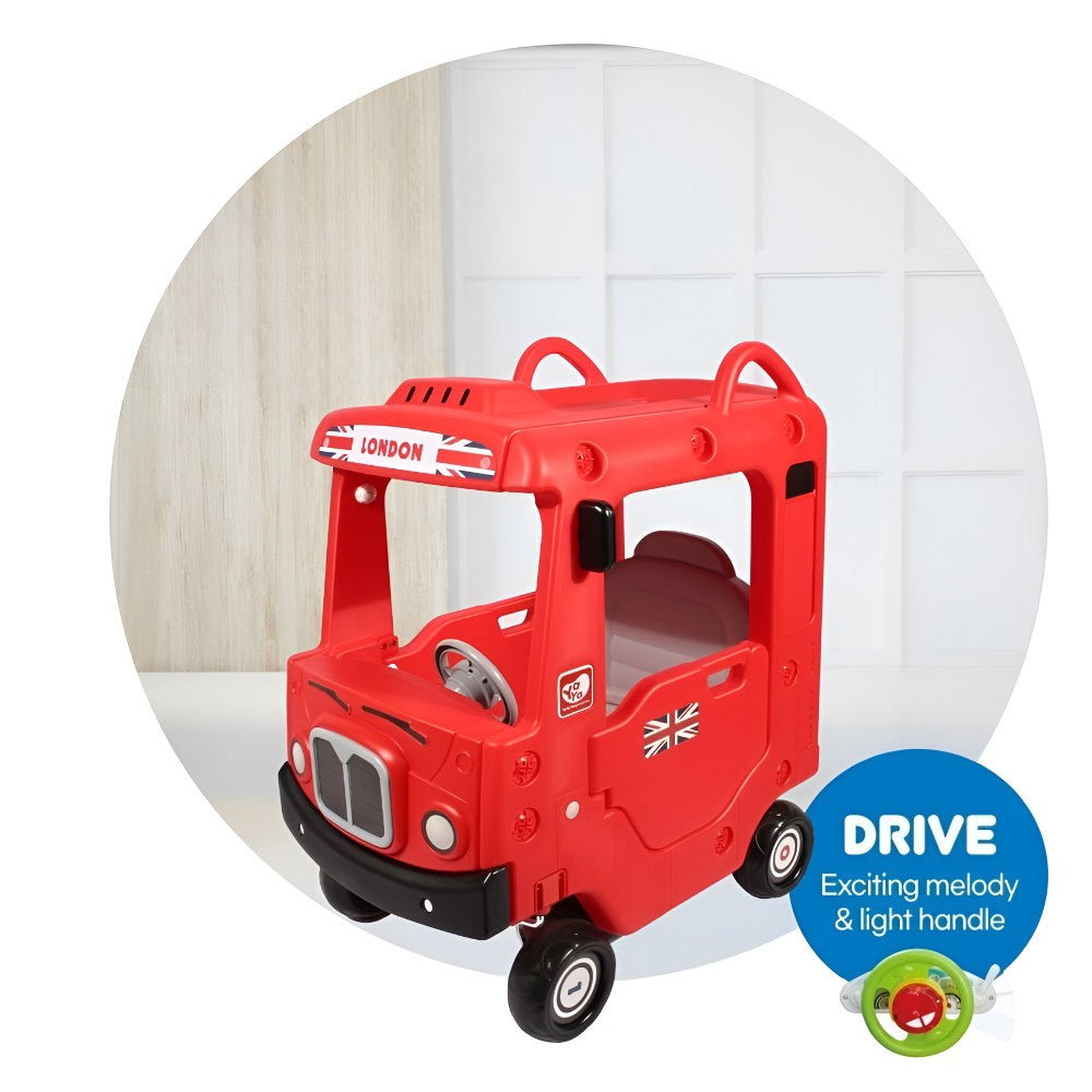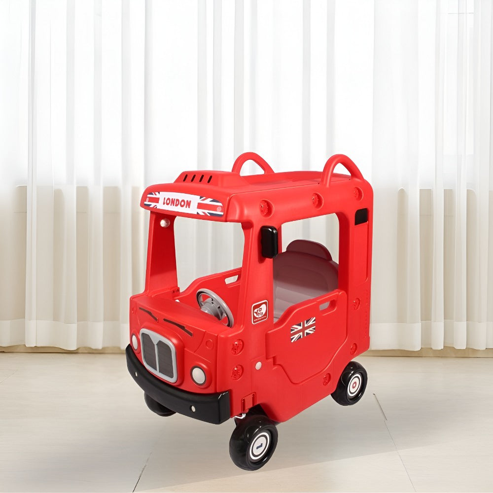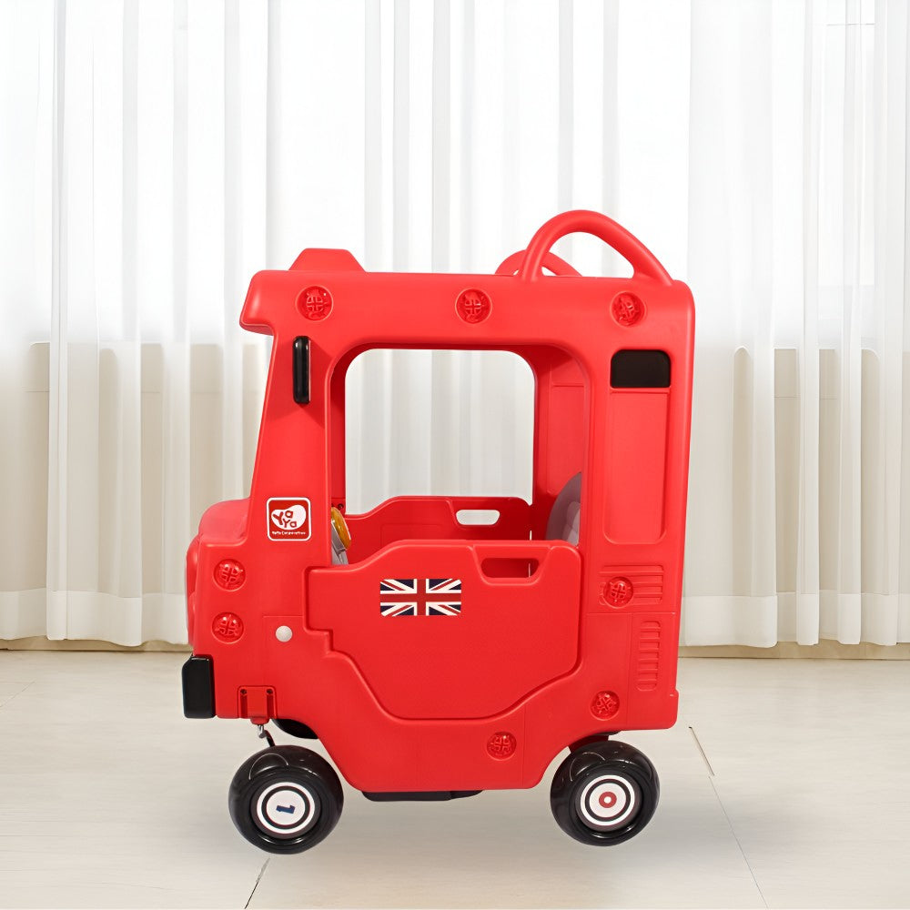 "Yaya London Bus Rooftop Car - A safe, quiet, and fun ride-on bus designed to support your child’s growth and development. This soft-roof car features double opening doors, noiseless EVA foam wheels, and a 360° rotating front wheel for smooth indoor riding without floor noise. The steering wheel comes with lights, melodies, and sound effects, making driving play more exciting. It offers a cute trunk-style storage space, a convenient handle for parents, and a sliding footrest that adjusts with your child’s growth. The spacious interior provides extra comfort for longer play.
